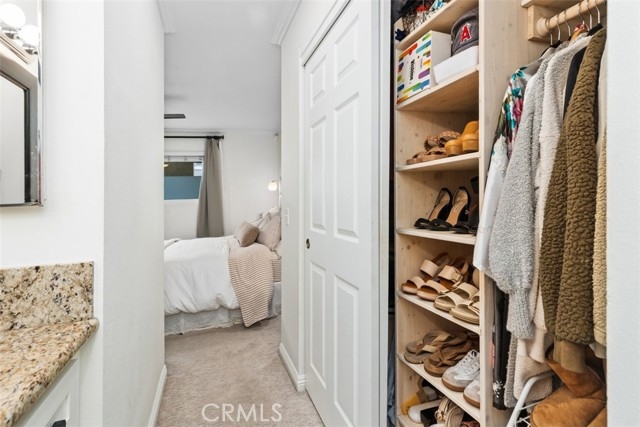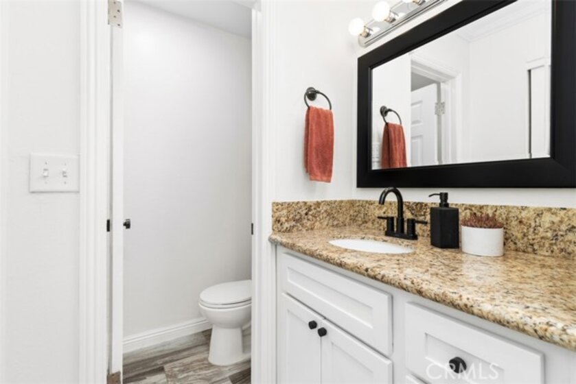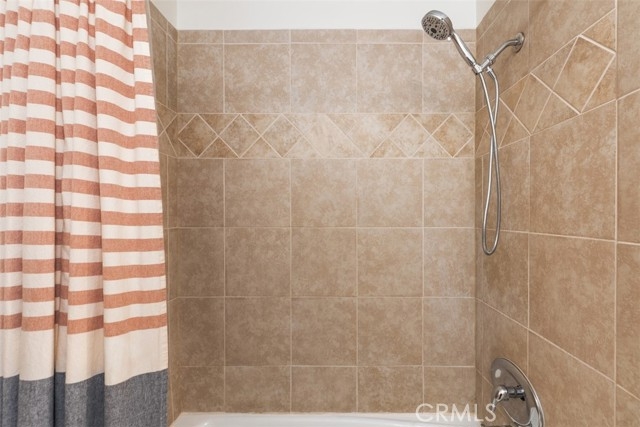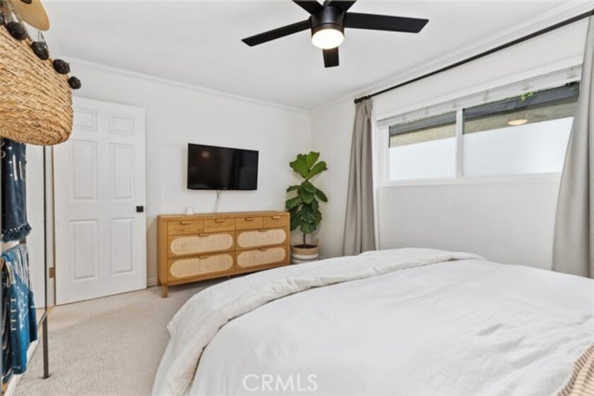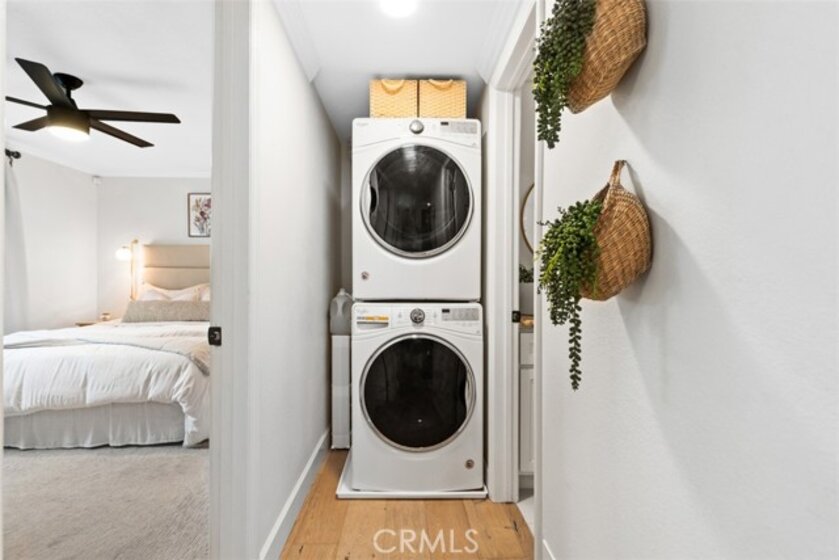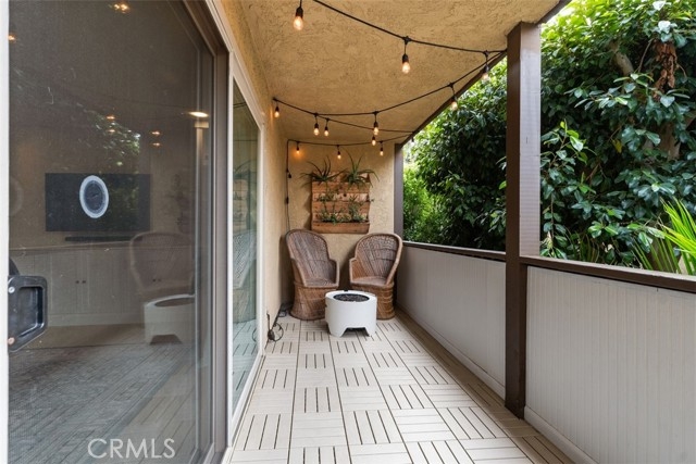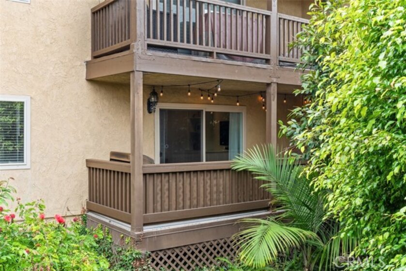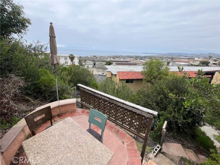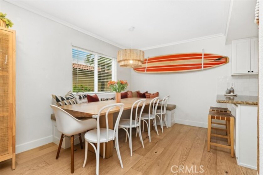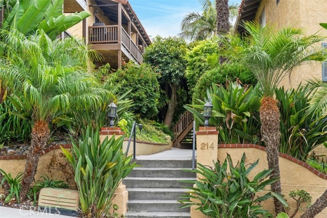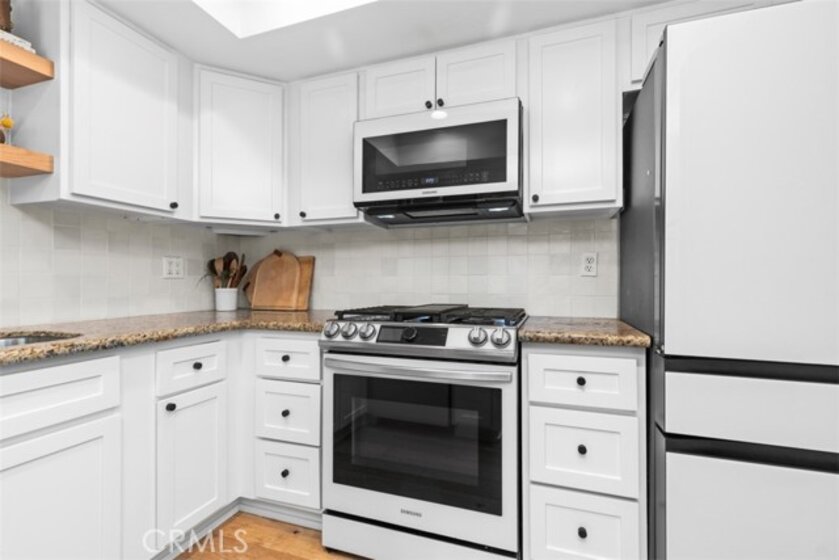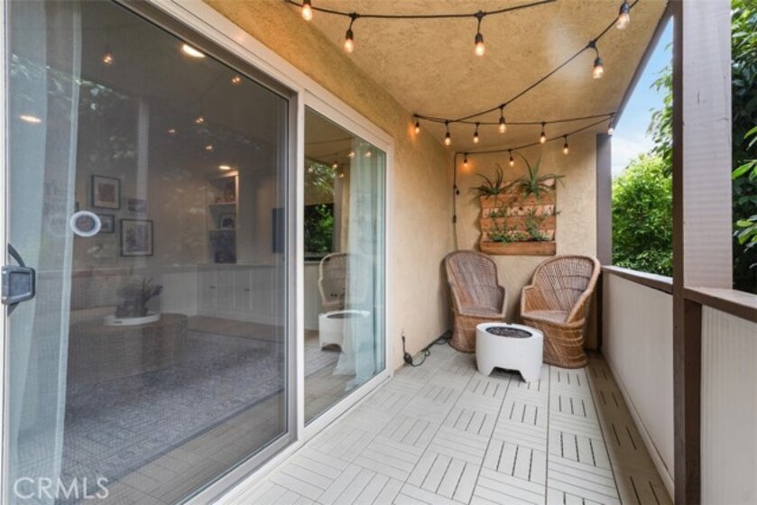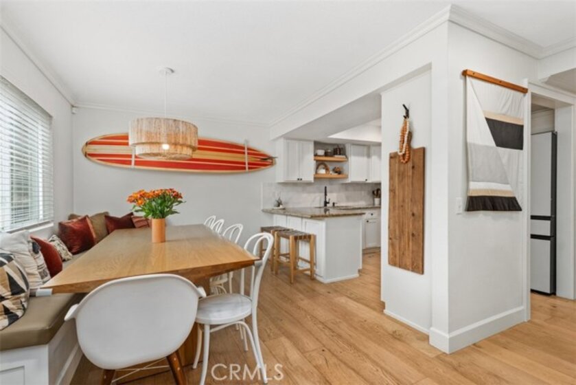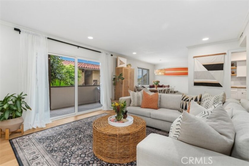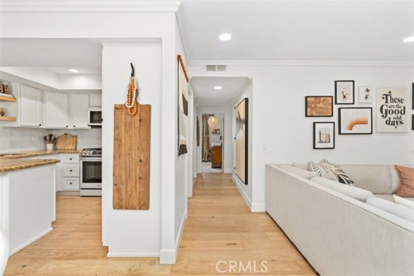 214 Via Robina #5 presents a stylishly renovated condo in the hills of San Clemente with inviting indoor spaces and relaxing views from the upgraded floating floor deck. Two bedrooms, two bathrooms and one car garage located on large cul-de-sac. The showpiece kitchen features modern Shaker cabinetry with CB2 matte black hardware, a handmade Zellige Moroccan tile backsplash with tight grout lines for sheer beauty, and granite countertops with a deep double sink. A suite of Samsung Bespoke matte black appliances, accented with white glass fronts, includes a five-burner gas range with oven, coordinating refrigerator, microwave and dishwasher. A raised ceiling with recessed lighting and an adjacent built-in banquette with custom cushions create a warm, functional dining space ideal for gatherings of up to 10–12. Both bathrooms have been elevated with designer mirrors, the primary featuring timeless marble flooring and the hall bathroom showcasing large-format porcelain floors and custom shelving. Throughout the home, brushed European oak engineered wood floors, finished with polyurethane for durability and beauty, add richness. Additional details include 4-inch crown molding, six-panel doors, and textured cut-pile carpet in the bedrooms. Each bedroom also offers a matte black ceiling fan for style and comfort. Other highlights include a central heater (installed 2016), dual-pane windows, custom built-in Shaker-style entertainment cabinetry in the living room, and a full-size stacked washer/dryer. For leasure enjoy the HOA common area garden for residents and common area patio with coastal and ocean views! This thoughtfully upgraded residence combines craftsmanship, comfort, and design — all within minutes of San Clemente’s beaches, shops, and restaurants.