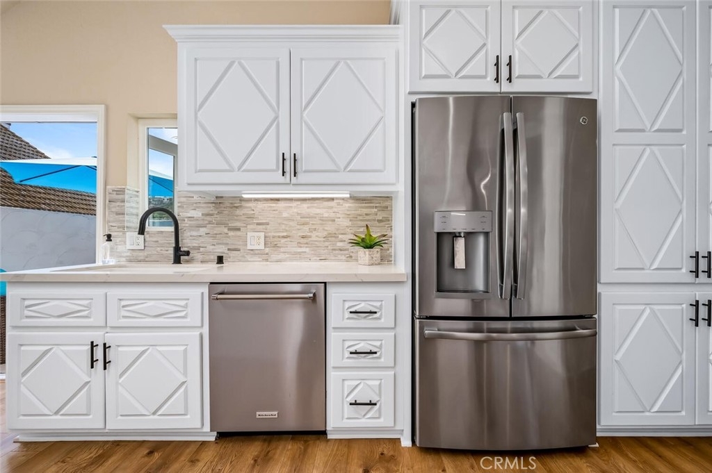 Quaint, Gated Community in a small enclave of 23 homes. Overlooking the Golf course, enjoy Hillside views by day, and City Light views by night on the large outdoor deck, plenty of room for dining and Lounging. Situated on a single loaded street, close to shopping and easy freeway access. 1.5 miles to the Beach, 4.5 miles to the Beautiful San Clemente Pier and Dana Point Harbor. Beautifully designed all white Kitchen, with Quartz Counter tops. Designer wood style flooring made of vinyl for low maintenance, through out the main living area. It’s soft and quiet, and looks and feels like hardwood. Both fireplaces have new stone surrounds, which make a lovely focal point and keeps the area warm and cozy. This unique home, has 4 Bedrooms and 2.5 Baths, Closets were removed in the secondary bedrooms. But wait, there’s more!!! an Office with a private entrance from the exterior, which could also be an additional bedroom. Large walk in laundry Room with a sink. Lot’s of additional storage areas, one on the lower level, with easy access for all those holiday decorations, and plenty of additional storage in the garage loft with a pull down ladder for easy access. The backyard has has a covered patio and artificial turf great for entertaining, and yet another added bonus, the yard maintenance front and back is maintained by the Association. Home is detached and zoned as a Condo.