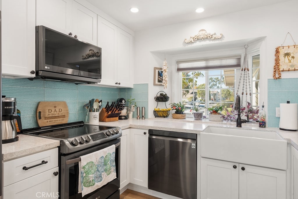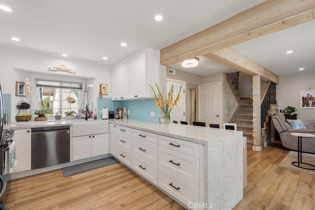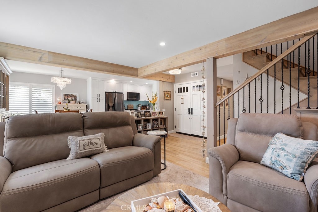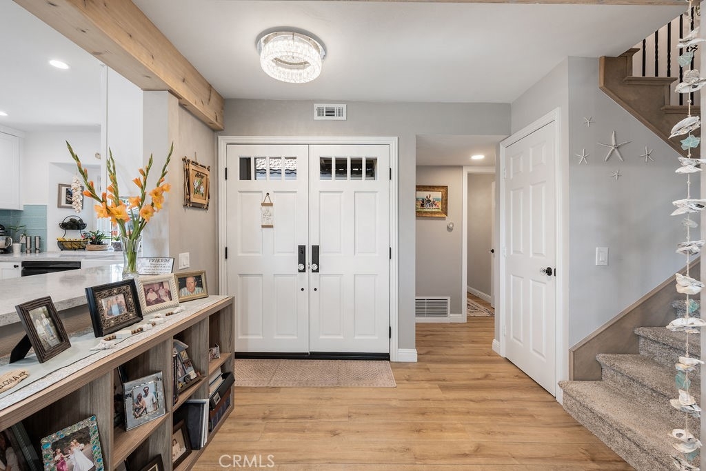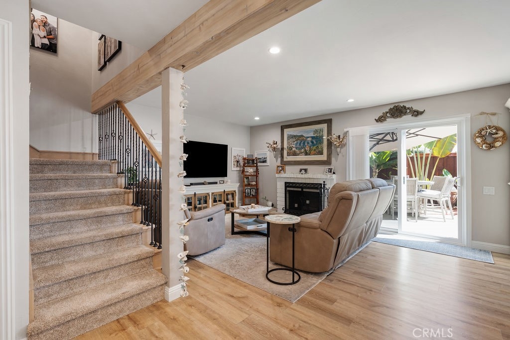 Welcome to coastal luxury living! This stunning 2-bedroom, 2.5-bathroom Corner unit condominium has been meticulously remodeled with high-end finishes and thoughtful upgrades throughout. This unit also offers a spacious Loft with a balcony! Which can easily be converted into a 3rd bedroom/office. Nestled in one of San Clemente’s most desirable communities, this turnkey home offers modern elegance and an unbeatable location just minutes from world-famous beaches, top-rated schools, and vibrant dining and shopping. Step inside to find all-new luxury vinyl waterproof flooring complemented by new carpeting. The fully renovated open-concept kitchen is top notch, featuring soft-close cabinetry, quartz countertops, and stainless steel appliances. The laundry room is also impressive with new cabinetry and quartz countertops. Every detail has been considered—from the new interior doors with custom glass doorknobs to the cedar-lined closets with custom shelving. The new lighting, ceiling fans, and canned lighting create a bright, inviting ambiance, while the new interior paint, moldings, and baseboards add a fresh, modern touch. The updated bathrooms are stunning! Enjoy the convenience of a new central heater and water heater, as well as new shutters and window coverings throughout. The oversized 2-car garage offers ample storage with custom cabinets. Outside, a spacious patio yard provides the perfect setting for outdoor entertaining. The HOA covers Water and Cable, community also features a pool and spa. The home even offers a peek-a-boo ocean view. This is a must-see for anyone seeking a move-in-ready beachside retreat. Don’t miss this rare opportunity to own a beautifully upgraded home in a prime location!