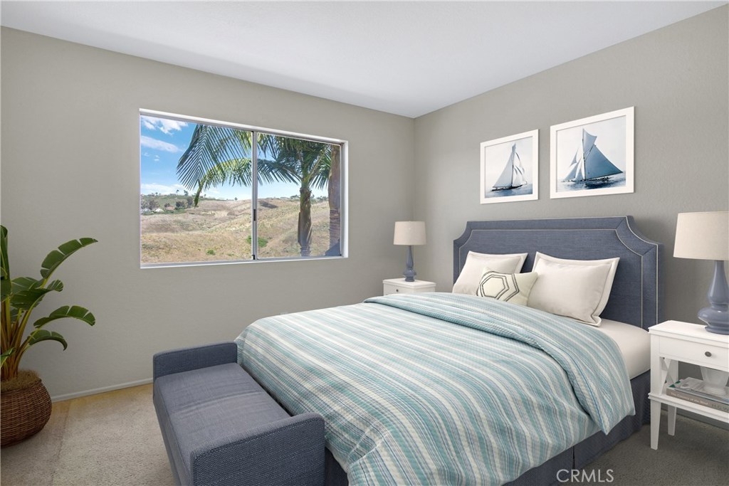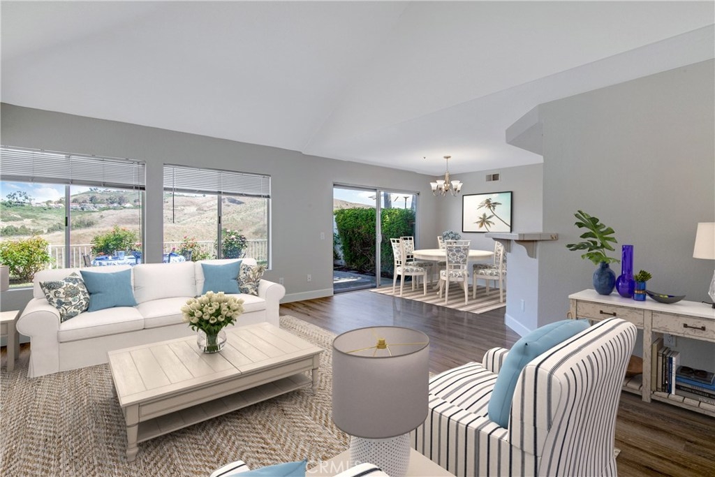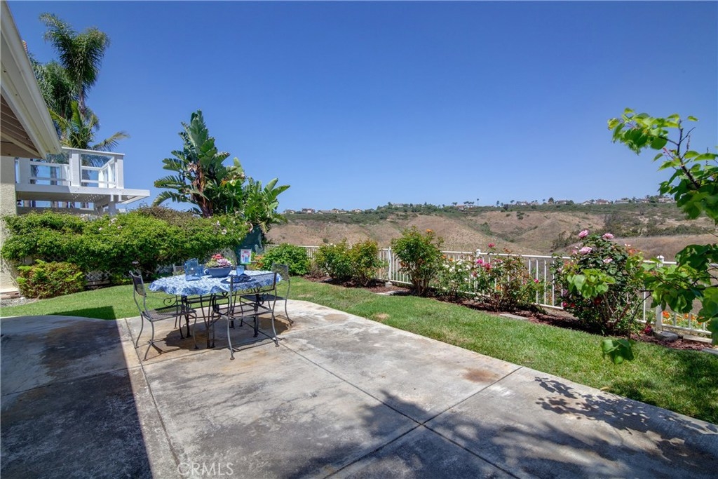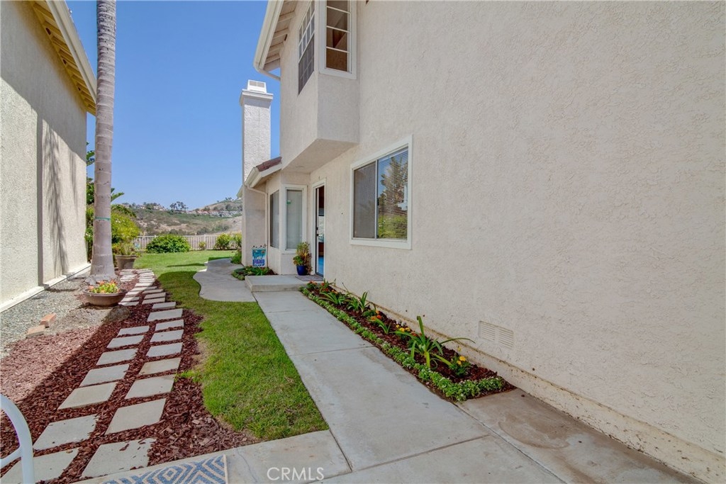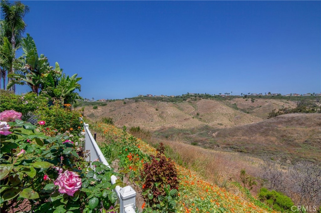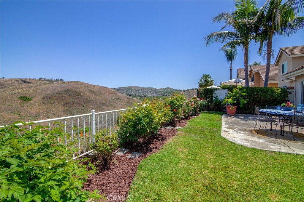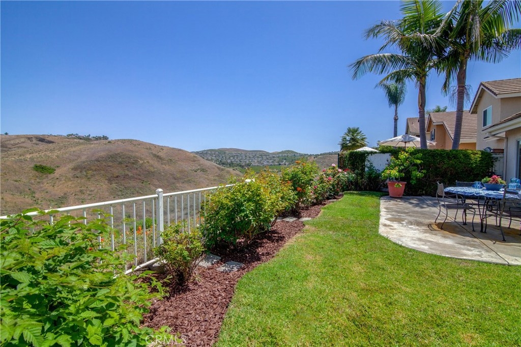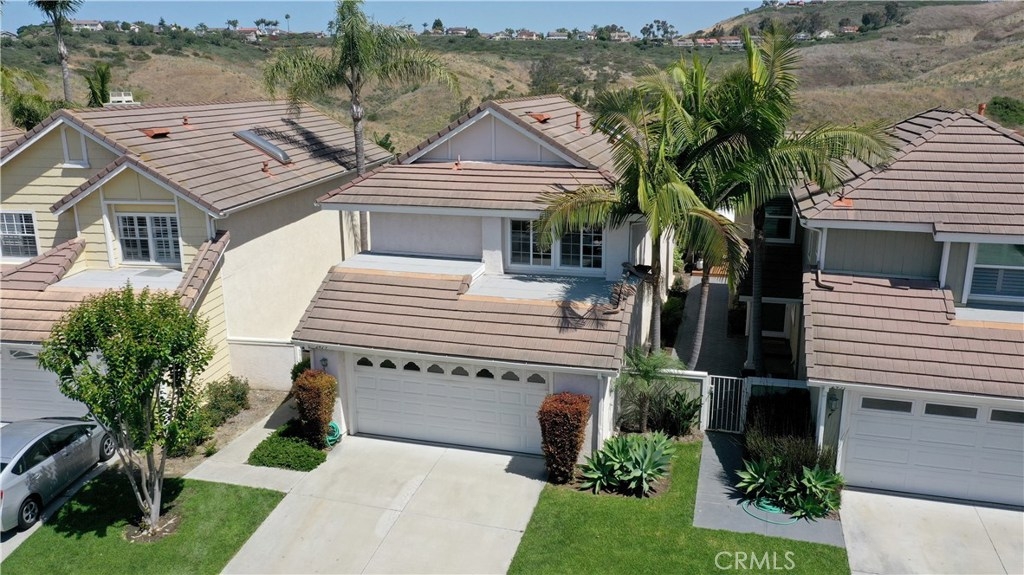 Location, Location! This recently refreshed home is ideally located near the end of a cul de sac with panoramic views of the canyon and hills offering the privacy and location you have waited for. The sought-after floor plan includes a main floor bedroom or den option, a full bath, and a large living area with a cozy fireplace and views to the backyard and the surrounding hillside. Upstairs you will find a generous master bedroom with a walk-in closet, double vanity, and a privacy door leading to the bathing area with a soaking tub. The back bedroom allows for the beautiful views of the hills and canyon. Recent upgrades include fresh neutral-toned interior paint throughout. Downstairs you will find new easy-care wide planked vinyl flooring in the living room, dining area, kitchen, and full bath. New enlarged baseboards have been added to frame the beautiful coastal style floors. The kitchen cabinets have been recently painted with new hardware installed. A new crisp white vanity, mirror, and lighting were added to the downstairs bath. Upstairs, the vanities in the two additional baths were freshly painted, new lighting was added in the hall bathroom. From the front gate you will enter the wrap-around yard area which offers fresh cool ocean breezes and plenty of space for outdoor entertaining and play as you take in the sweeping views. HOA maintains exterior paint, roof, front yard, front & back fencing & more! Near beaches, shopping, restaurants & Aquatics Center