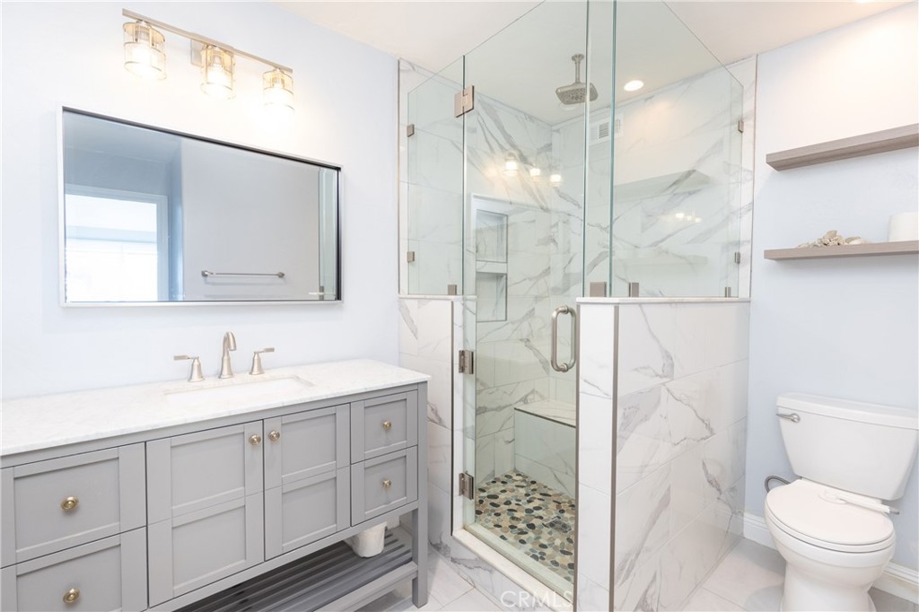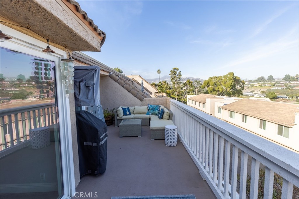 Walk to the beach from this recently updated condo with PANORAMIC hillside and peek ocean views! Unique, open layout with newer kitchen, wood-like, tile flooring and master bathroom. Prepare meals in the chef's kitchen featuring granite counters, white cabinets, stainless appliances and eat-in dining area. Three bedrooms/two full baths, porcelain tile floors and in-home laundry room make this home a breeze to clean and perfect for beach living. Light and bright condo with neutral decor and vaulted ceilings. Kitchen was re-engineered with a large beam to create an open layout into the living room, which is a true bonus to this home. Watch the dynamic marine layer roll in and out, while overlooking hillside and peek ocean views from the large entertaining deck. One flight of stairs up to condo entry from one-car garage and one assigned parking spot. Close to world-class San Clemente beaches and beach trail (1,100 steps away), shopping, restaurants and the 5 freeway. This home is appealing as a full-time residence or second home to enjoy all that San Clemente has to offer.