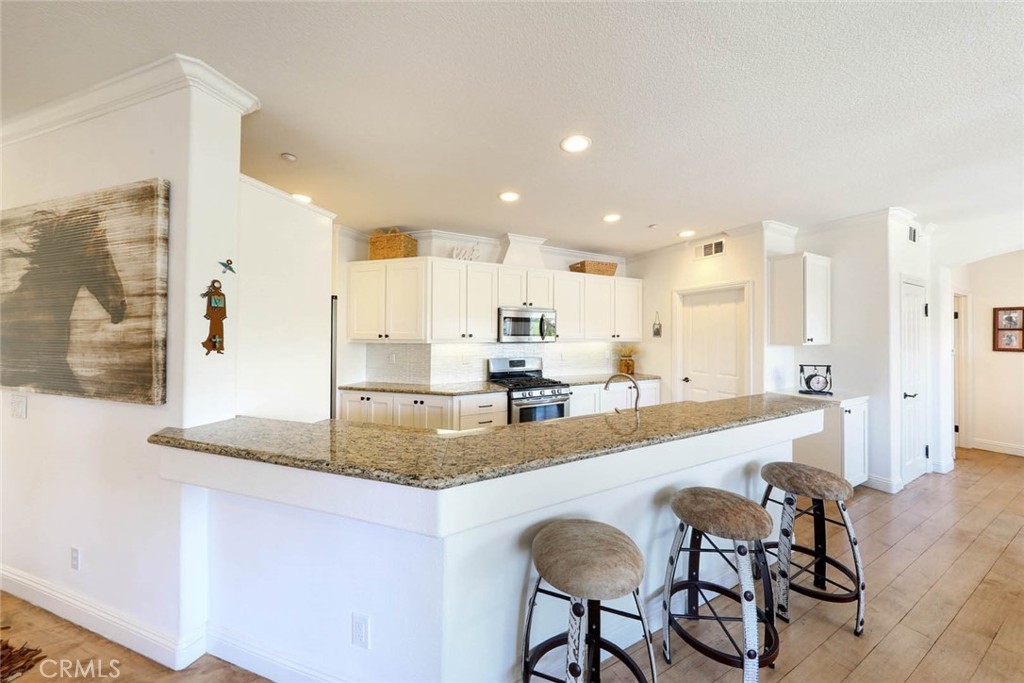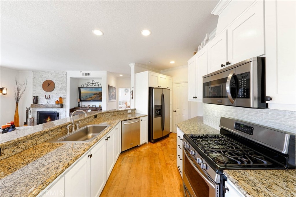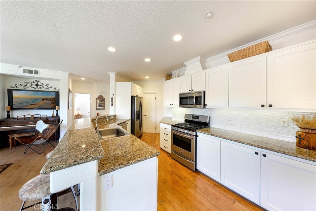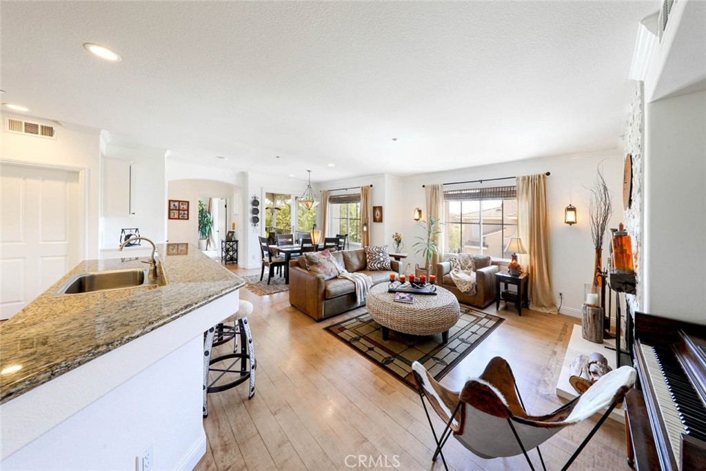 Amazing location with beautiful mountain views from every room! Private single level living with no homes above or below you! Highly upgraded and updated and looks like a model home! Featured are high ceilings, crown molding, distressed Canadian Maple hardwood floors and walls of windows! The stunning Kitchen features white cabinetry with upgraded maple soft close doors, glass tile backsplash, stainless steel appliances and walk-in pantry, plus a separate Laundry Room with all hookups. The Master Suite includes an oversized walk-in closet, and custom travertine tiled Master Bath. The second bedroom includes a nook, perfect for desk if used as an office, relaxing jacuzzi tub in the bathroom and a slider leading to the spacious, covered view balcony. There is also a slider to the balcony from the Dining Room/Living Room area. The views are beautiful and serene! A modern stone fireplace with custom mantle and entertainment nook are featured in the Living Room. But, honestly, with the kitchen, breakfast bar, living room and dining room all combined, this is really an open Great Room floorplan which is fantastic for entertaining and living the casual beach community lifestyle! The oversized 2-car garage includes extra storage in two areas, plus abundant shelving. Beautiful opportunity to live in San Clemente's jewel community of Talega! This turn-key Trinidad condo is located close to the community pool and spa, Talega Park, playground, walking trails, and just minutes from the Talega Swim and Athletic Club! When you consider all the amenities that Talega has to offer, it is no wonder that this community is so popular! Great shopping, great beaches, great schools, great place to live!