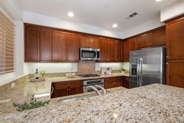 END OF THE TRACT, END OF THE CUL DE SAC LOCATION IN THE TALEGA TRACT OF VERANO. This sought-after location in the hills of San Clemente showcases a greenbelt view and a desirable carriage unit floor-plan with no neighbor above. The property has been meticulously maintained with exceptional pride of ownership. New carpeting up the stairs from the entry up the condo. An open concept kitchen with granite countertops and ample cabinets comes with a stainless steel refrigerator, plus has a new stainless steel microwave and dishwasher. The kitchen is open to large great room with ceiling fan, fireplace plus a sizable dining room area. The balcony is the perfect place to enjoy some outdoor space. There is a dedicated inside laundry room with washer and dryer included. A full bathroom room with a jetted tub is in the hallway and close to the secondary bedroom as well. The large secondary/guest bedroom has new carpet. The primary bedroom has a large walk-in closet and a dual vanity sink and walk in shower. Direct access from house to the oversized 2-car tandem garage. Additional upgrades include Italian tile flooring in all rooms except the bedrooms and custom window coverings and shutters. The Verano tract offers a community pool and spa, walking trails adjacent to the property, open grass areas and convenient distance to local award winning, Vista Del Mar Elementary/Middle Schools nearby. The well-planned Talega community offers its residents resort-style amenities including two lap pools (heated year-round), two recreation pools (seasonal), 19 miles of hiking trails, programs, clubs, special events, a sports court, a sand volleyball court, tot lots and so much more
