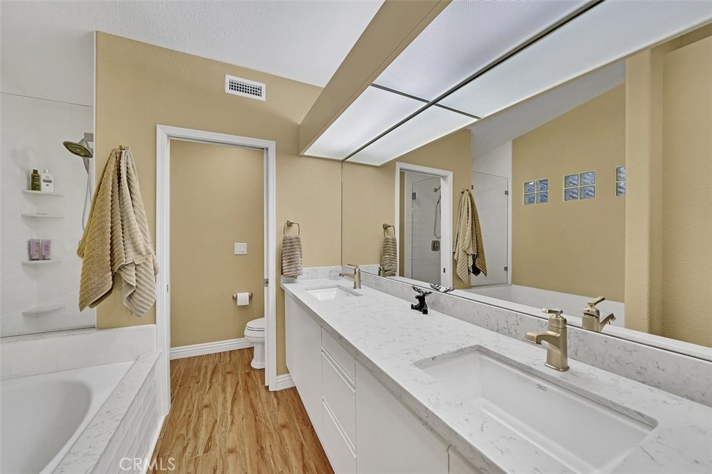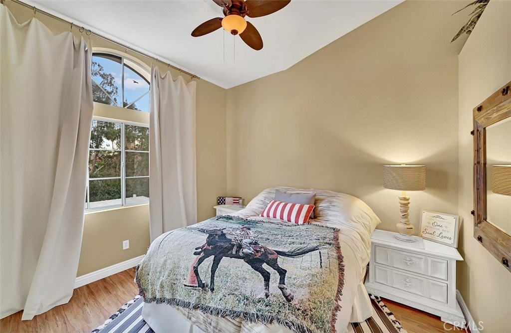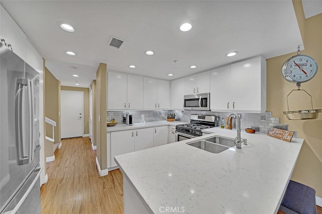 This Absolutely Stunning open floorplan, Turn Key, Highly Upgraded, End Unit with Extensive Upgrades. Enter into 20' High Vaulted Ceilings, Natural wood looking laminate with a Beautiful Gourmet Kitchen including White Granite countertops, Brushed Nickel backsplash, Stainless steel appliances and bar top seating. Floor to Ceiling Windows let in Plentiful Natural Light. Master Bedroom features Private Balcony, Fireplace, Vaulted Ceilings as well as Dual Sink Vanities with Granite Countertops, Soaker Tub, and Walk-In Shower. This property also features a Loft which can be easily converted to a 3rd bedroom. This end unit has 2 car direct garage access as well as private rear patio yard overlooking lush hillside. Low HOA and no Mello Roos assessments.