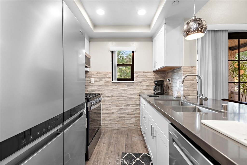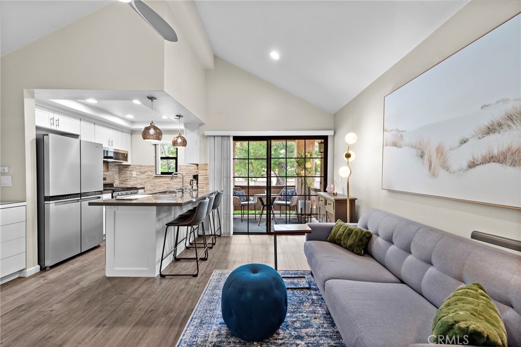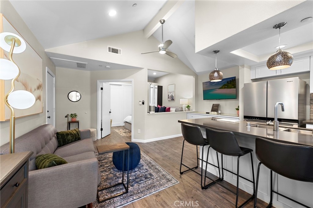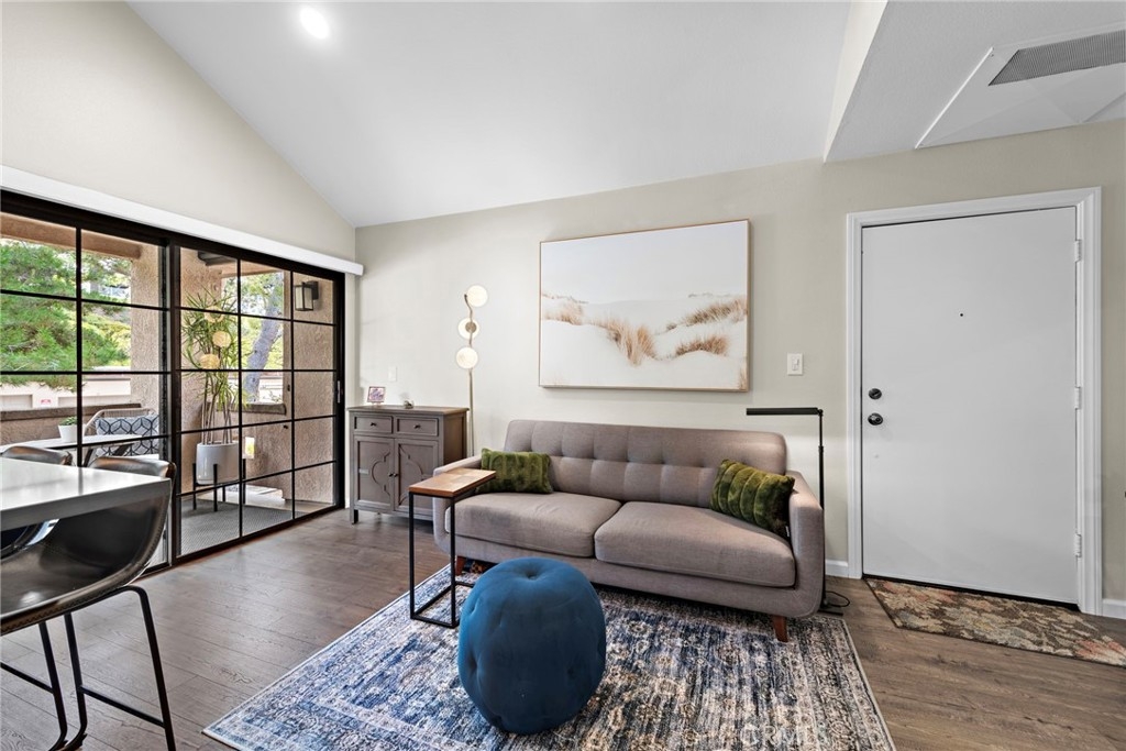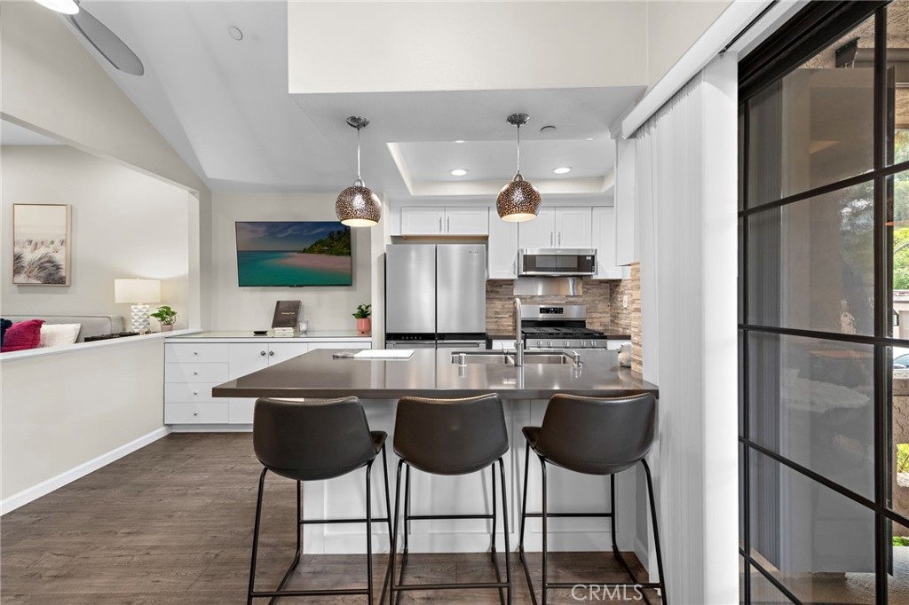 Discover coastal living in this beautifully updated 1-bedroom, 1-bath upper-level condo nestled in the sought-after Vista Pacifica community of Rancho San Clemente. This light and bright home features vaulted ceilings, new LED recessed lighting, ceiling fans, and all-new laminate wood flooring throughout. The stylish kitchen has been completely remodeled with quartz countertops, upgraded cabinetry, and brand-new stainless steel appliances—including a refrigerator and in-unit stackable washer and dryer. Enjoy your morning coffee on the private patio overlooking lush landscaping and serene waterfalls that wind through the community. Additional highlights include a detached one-car garage with ample storage and guest parking nearby. Community amenities include two sparkling pools, relaxing spas, and a clubhouse. Ideally located close to the beach, hiking trails, parks, golf, shopping, walking distance to Lifetime Fitness and easy freeway access. Perfect for first-time buyers, investors, or those looking to downsize and enjoy the Southern California lifestyle!