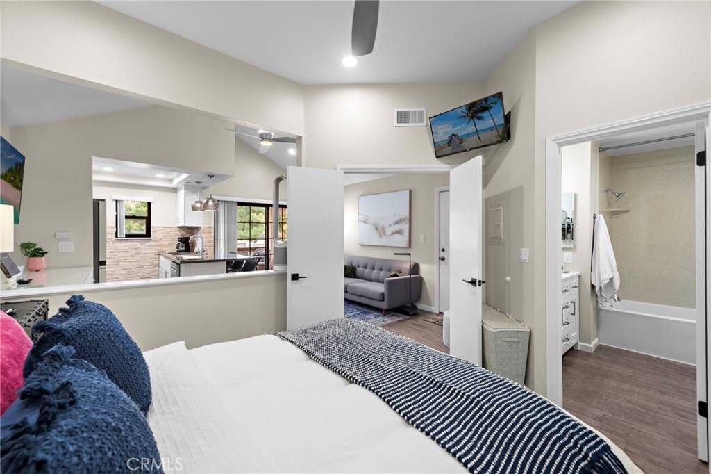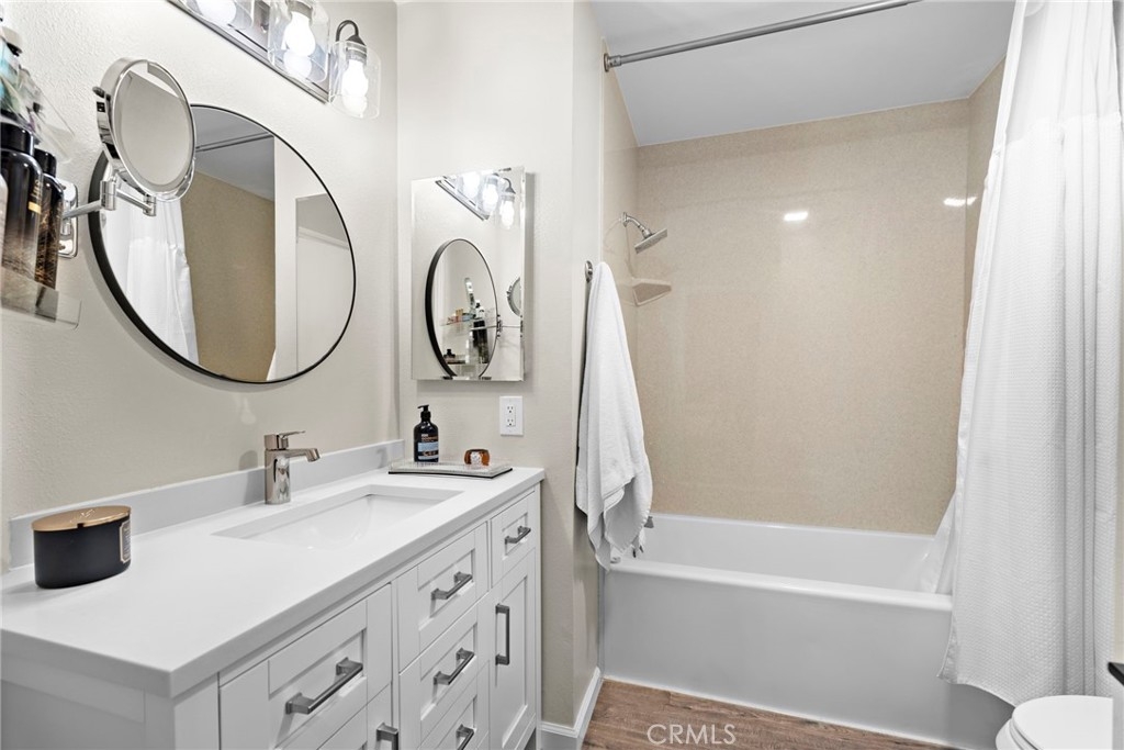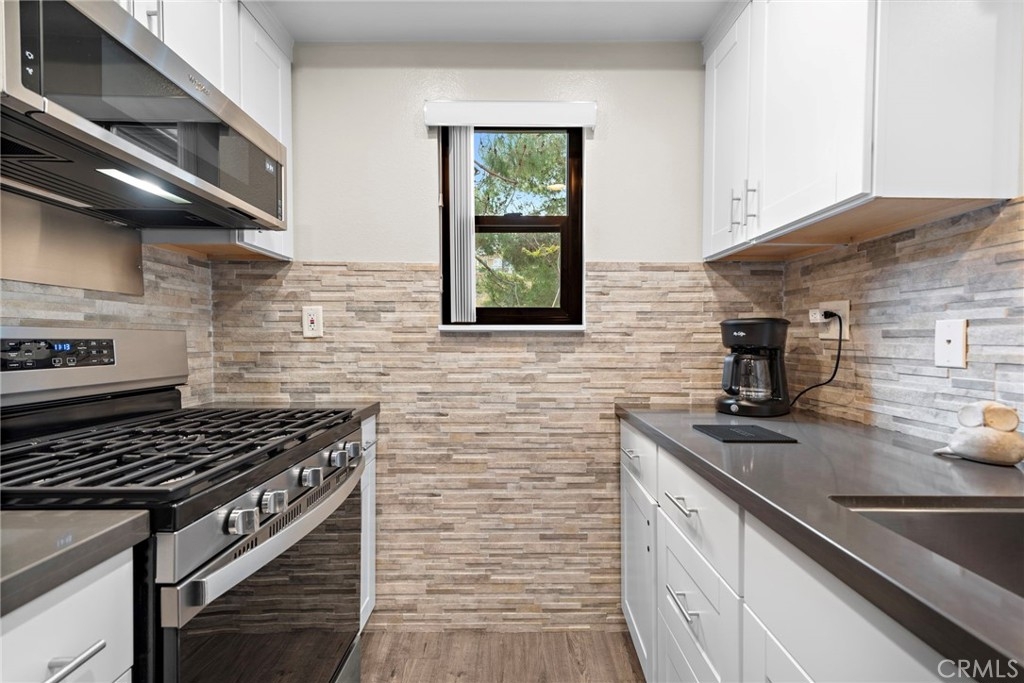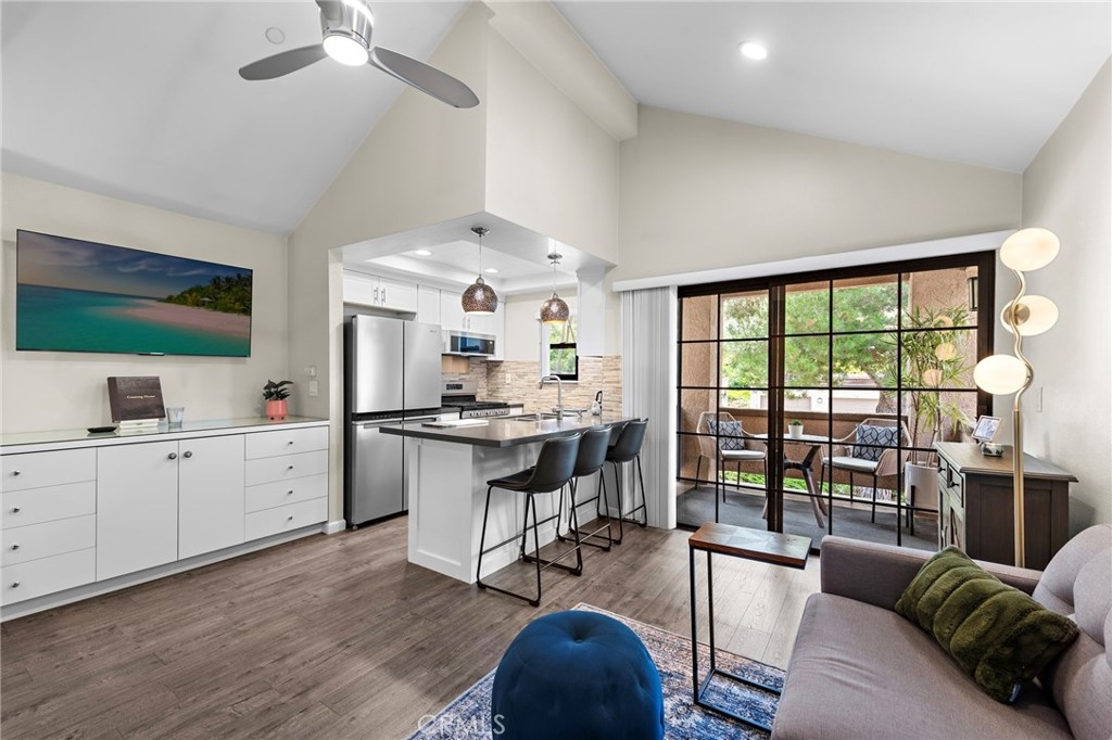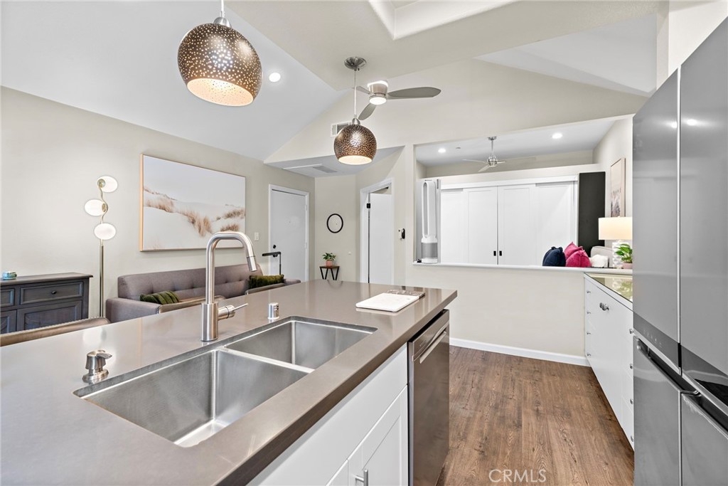 Discover coastal living in this beautifully updated 1-bedroom, 1-bath upper-level condo nestled in the sought-after Vista Pacifica community of Rancho San Clemente. This light and bright home features vaulted ceilings, new LED recessed lighting, ceiling fans, and all-new laminate wood flooring throughout. The stylish kitchen has been completely remodeled with quartz countertops, upgraded cabinetry, and brand-new stainless steel appliances—including a refrigerator and in-unit stackable washer and dryer. Enjoy your morning coffee on the private patio overlooking lush landscaping and serene waterfalls that wind through the community. Additional highlights include a detached one-car garage with ample storage and guest parking nearby. Community amenities include two sparkling pools, relaxing spas, and a clubhouse. Ideally located close to the beach, hiking trails, parks, golf, shopping, walking distance to Lifetime Fitness and easy freeway access. Perfect for first-time buyers, investors, or those looking to downsize and enjoy the Southern California lifestyle!