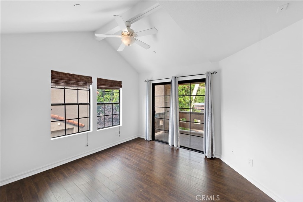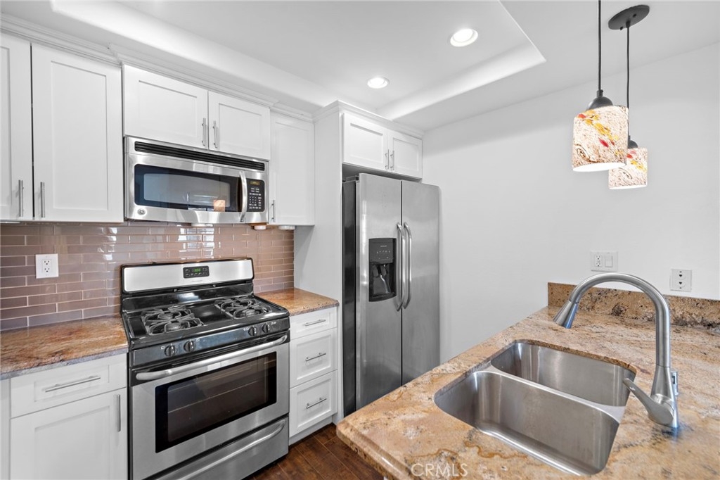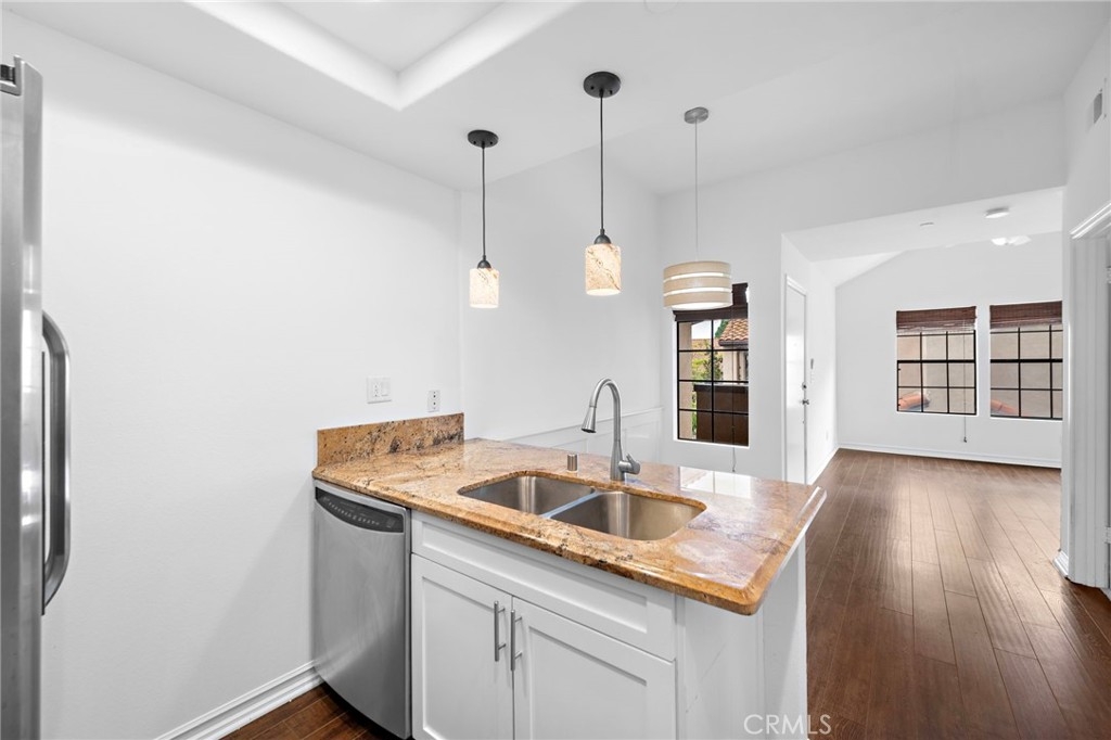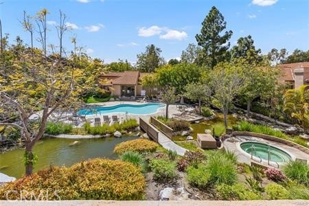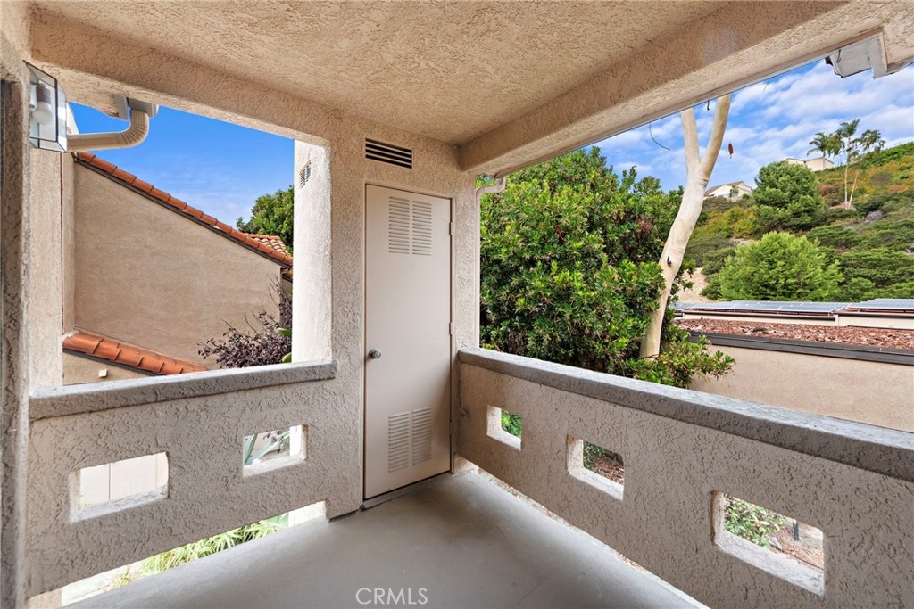 Enjoy the relaxing sounds of the community waterfall and streams from this upper level corner unit. Situated near the pool and near the back of the complex, this location is extremely desirable. This desirable home offers ample living space and a spacious patio and is the largest one bedroom floor plan. Tall windows and vaulted ceilings in living room provide tons of light and sense of space. Vinyl flooring in living room, dining area and kitchen adds continuity to floorplan. Upgraded kitchen features newer cabinets, granite countertops and stainless steel appliances. A stacked washer/dryer is included. Sliding glass doors to patio from both living room and bedroom allow seamless inside/outside living. Oversized bedroom and huge walk in closet are surprising additions to this home. Sliding glass doors to patio allow seamless inside/outside living. Newer bathroom vanity and tons of storage add additional value. Relax on your patio and take in the sounds of the water feature and views out to the hillsides. One car garage is situated close to the property. Vista Pacifica is a sought after community with access to two pools plus the beautiful streams, waterfalls and community walking paths. Association offers on-site RV/boat parking (if available). Just a short drive to award winning beaches and the downtown Village with shops and restaurants, the San Clemente lifestyle awaits.