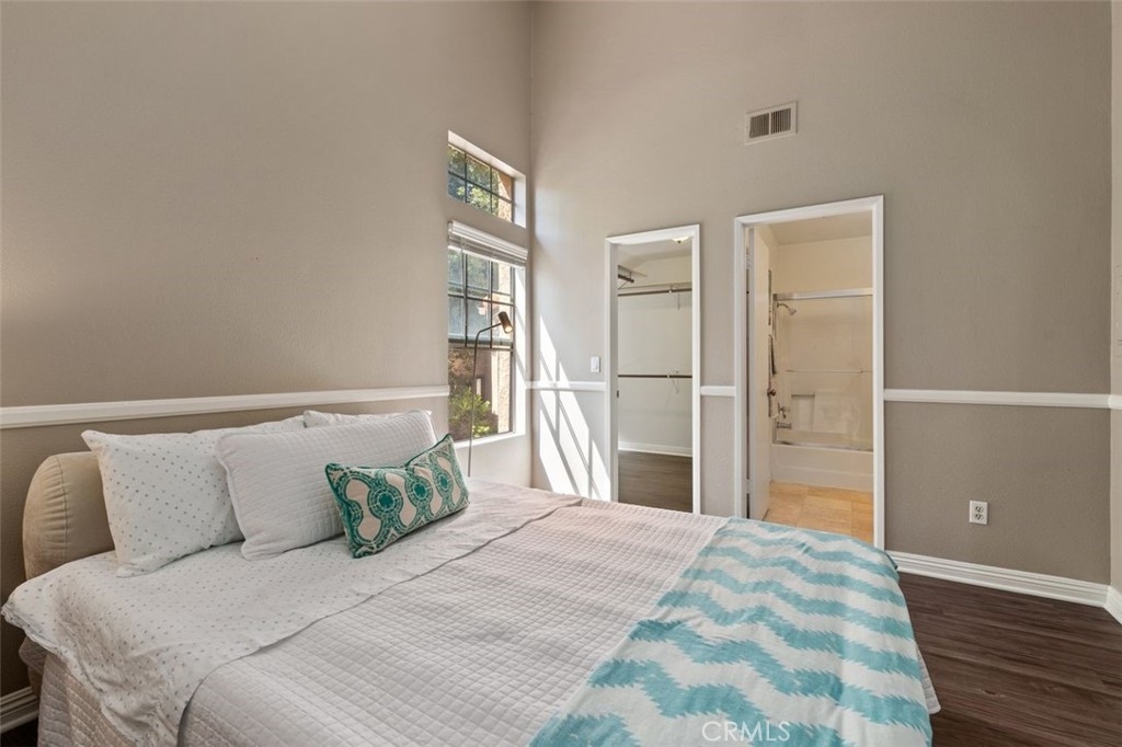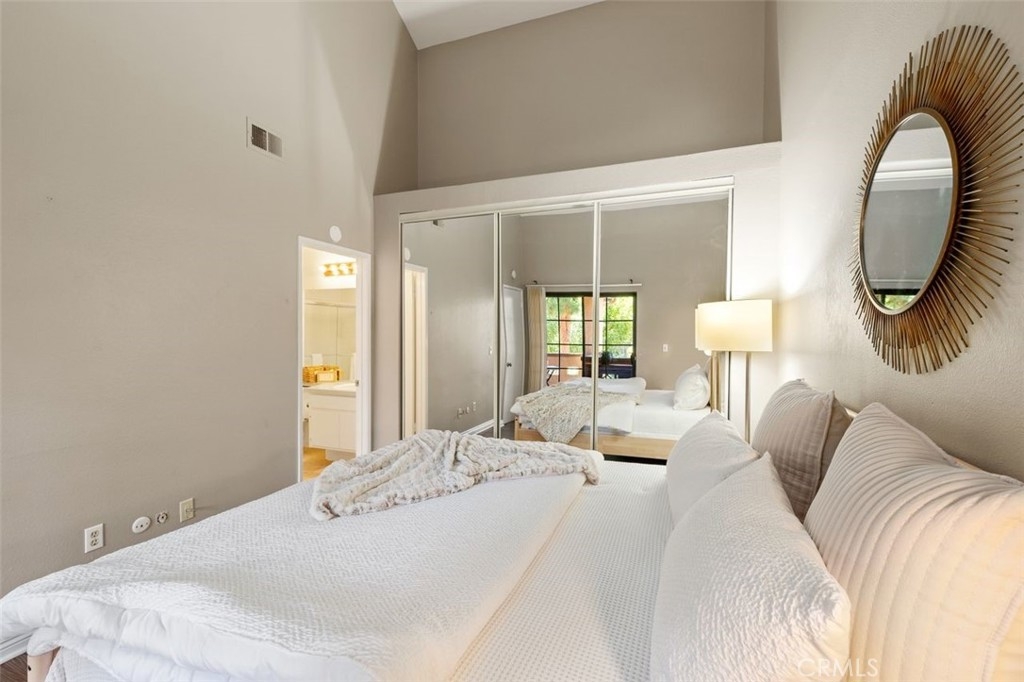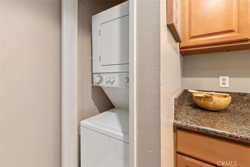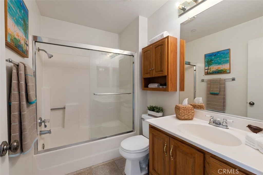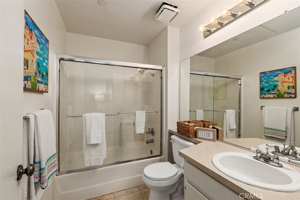 LOCATION LOCATION LOCATION. Great location within this beautiful condo complex. This is the model with a large upstairs private deck, with a lockable outside door, that has a wonderful view of the pool, waterfalls and streams. Two separate en-suite bedrooms with a living area in the middle, make it perfect for sharing. Large closets in both bedrooms. The kitchen has granite countertops and stainless appliances. On-trend vinyl flooring. No carpet here! There is a washer and dryer located inside. A one-car garage is included and one parking pass. There is an RV storage area when available. Come enjoy the beach lifestyle! Minutes to some of the best beaches and surfing in South Orange County. Take in the views from the historic pier, and shop at the newer outlet center in town. We have a lovely quaint downtown area in San Clemente with a community center, a library, fabulous restaurants, and shops.