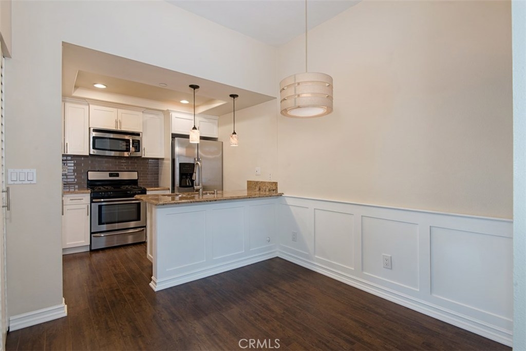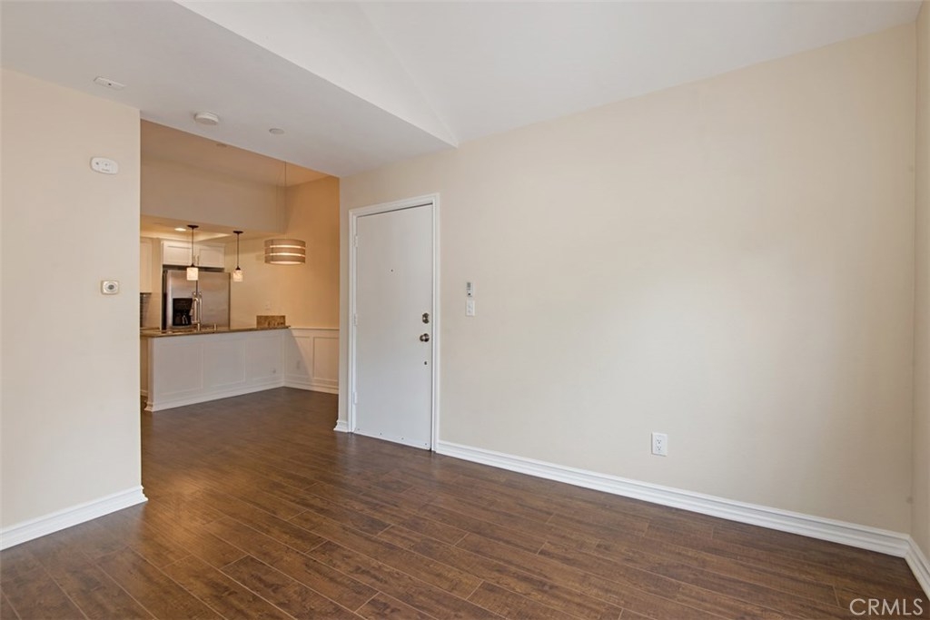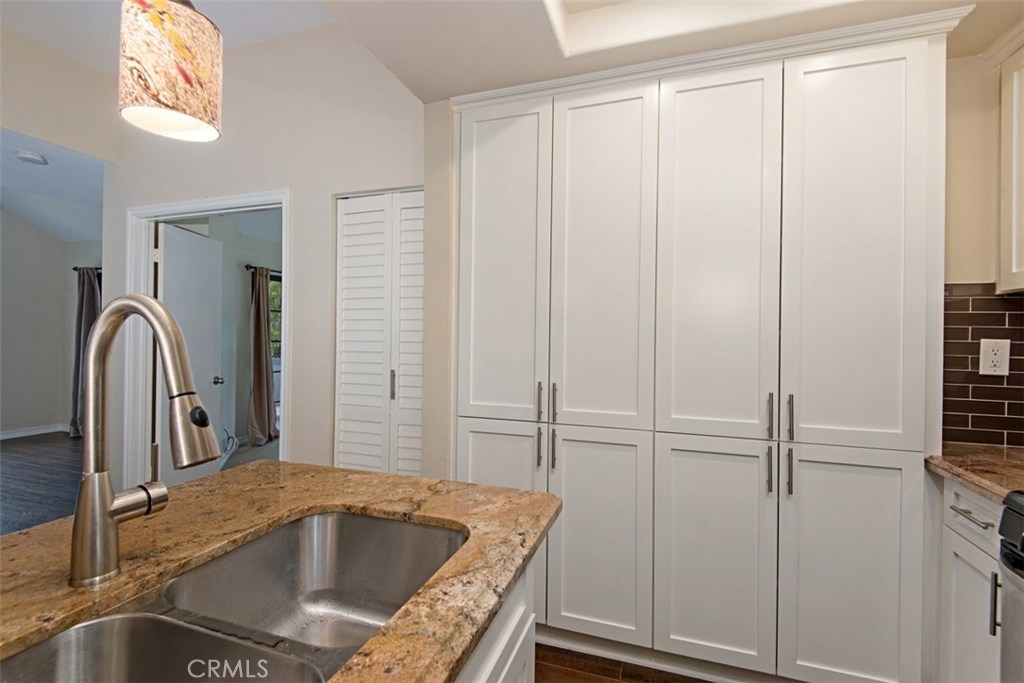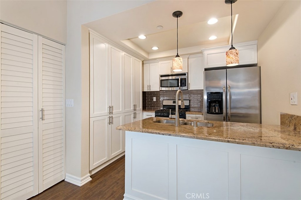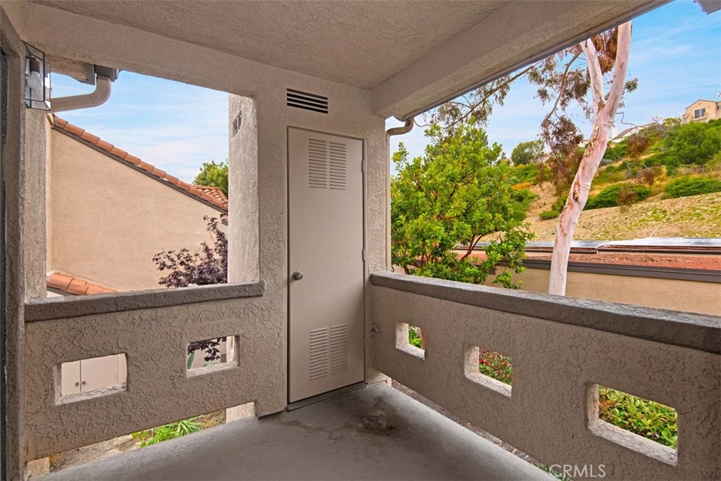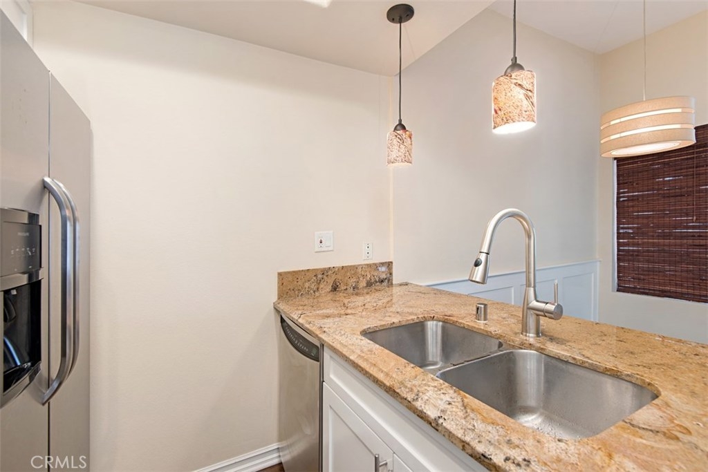 Charming end unit with private location. This 1 bedroom 1 bath upper level unit in the Vista Pacifica Community has been completely renovated with upgraded laminate wood flooring, granite countertops, upgraded cabinets and stainless steel appliances! Vaulted Ceilings, Light and Bright, and Recessed lighting. Condo comes with its own detached one car garage with plenty of storage and parking space. Inside laundry area, stackable washer and dryer and refrigerator are included. Lovely patio overlooking lush landscaping and association pool with Tranquil waterfalls throughout the complex. The complex includes two pools, spas and clubhouse. Great location near the 5 freeway, close to the beach, parks, golf course and shopping.