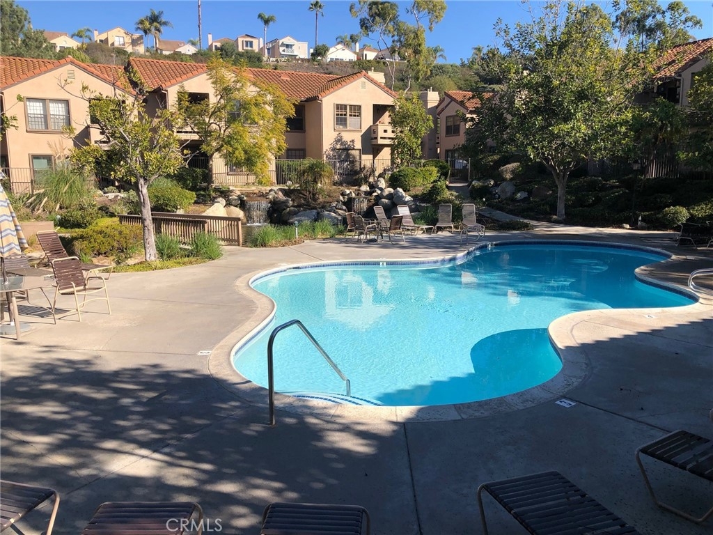 Upper End Unit Vista Pacifica! Ideally located, this private end unit townhome is surrounded by mature trees and overlooks the tranquil community waterfall fed ponds, pool and spa. Enter into the spacious open plan living and dining area with cathedral ceilings, laminate wood flooring and natural light. The kitchen has granite counters, white cabinets, stainless steal appliances and a nice dining counter. Each of the 2 bedrooms has its own en-suite bathroom, adding to the resort style feel of this floor plan. Located in beautiful Rancho San Clemente, the property enjoys direct access to hiking and biking trails with a short drive to beaches, shops, golf, restaurants and shopping.