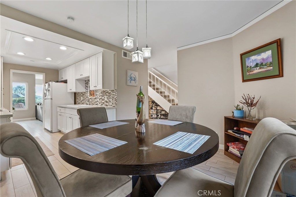 Welcome to 2162 Calle Ola Verde, a thoughtfully updated 3 bedroom, 2.5 bathroom condo located in the highly desirable Faire Harbour community of San Clemente. This two-story home sits less than a mile from North Beach and offers a comfortable blend of modern upgrades, practical layout, and coastal convenience. The main level features an open floorplan with wood-look tile flooring, creating a clean and durable foundation for everyday living. The living room flows into the dining area and breakfast nook, while the upgraded kitchen includes quartz countertops that provide both style and easy maintenance. Upstairs, the spacious primary suite serves as a quiet retreat with peek-a-boo ocean views and a generous walk-in closet. The adjoining bathroom has been remodeled with a walnut vanity, designer tile, and Art Deco inspired accents. Two additional bedrooms offer flexibility for guests, family, or a dedicated home office, and both feature comfortable natural light. A second full bathroom is conveniently located off the hallway. The full-size upstairs laundry adds to the overall ease and functionality of the home. The community is well maintained and has a relaxed, welcoming feel. Wide greenbelts weave throughout the neighborhood, ideal for morning walks or spending time outdoors. Residents enjoy access to a sparkling pool and spa, a sand volleyball court, and abundant guest parking. The community is also pet-friendly, making it a great fit for a variety of lifestyles. Additional features include a detached two-car garage, walk-in closets in two bedrooms, wood-look tile flooring downstairs, comfortable carpet upstairs, and tasteful upgrades throughout. The location offers excellent convenience, with close proximity to The Outlets at San Clemente, downtown restaurants and shopping, nearby beaches, and quick access to the 5 Freeway for commuting. Title shows 34 more sqft than Cubicasa generated floorplans. Buyer to independently verify. Thoughtfully maintained and move-in ready, this condo presents an outstanding opportunity to enjoy coastal living in San Clemente.