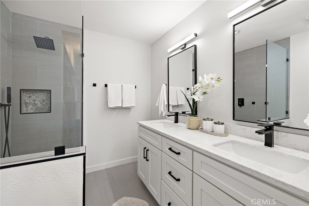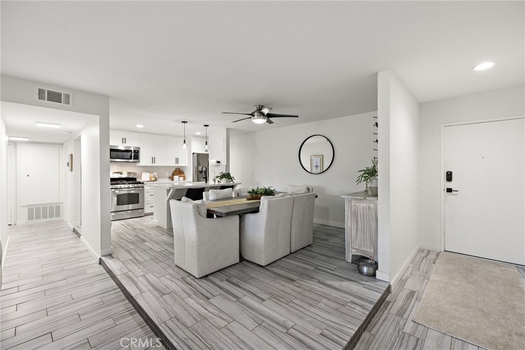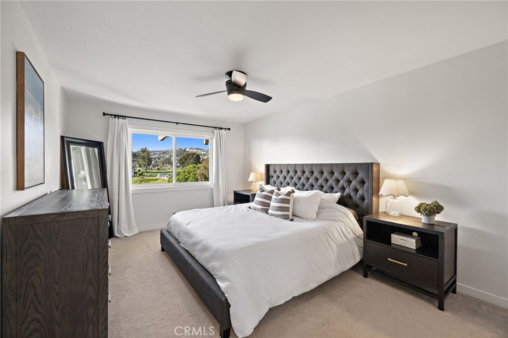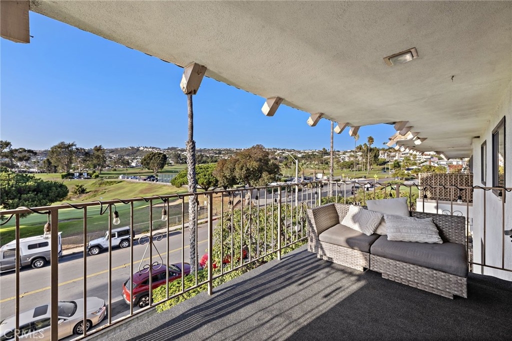 Perched on the top level of the Ocean Fairways community, this upgraded two-bedroom, two-bath home offers 1,326 square feet of single-level living and a rare vantage point over the lush fairways of the San Clemente Municipal Golf Course, with glimpses of the ocean beyond. Large windows and a spacious covered balcony draw in light and capture the home's tranquil setting. Inside, a modern concrete fireplace with custom mantel anchors the open living area. The kitchen combines quartz countertops, subway tile accents, ample cabinetry, and breakfast-bar seating for effortless everyday use. The primary suite enjoys wide golf course views, a generous closet, and an updated bathroom with double vanity and walk-in shower. A secondary bedroom and full bathroom complete the layout, while a dedicated laundry closet adds everyday convenience. Residents enjoy a private, gated community with countless amenities — pool, spa, tennis courts, recreation lounge with kitchen and fireplace, fitness rooms with saunas, and secure building access. HOA dues include water, cable TV, sewer, trash, insurance, and exterior maintenance — offering exceptional value and low-maintenance living. The location is a standout. Set directly across from the San Clemente Municipal Golf Course, the home also offers easy access to Vista Bahia Park and San Luis Rey Park for outdoor recreation. Plus, it’s only .9 miles to Calafia Beach, 1.6 miles to downtown San Clemente, and a short ride to Trestles, one of Southern California’s most coveted surf breaks. Golf cart and e-bike accessibility make it simple to reach beaches, parks, shops, and dining, while the community’s price point offers a more attainable way to enjoy the coveted coastal lifestyle San Clemente has to offer.