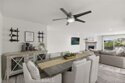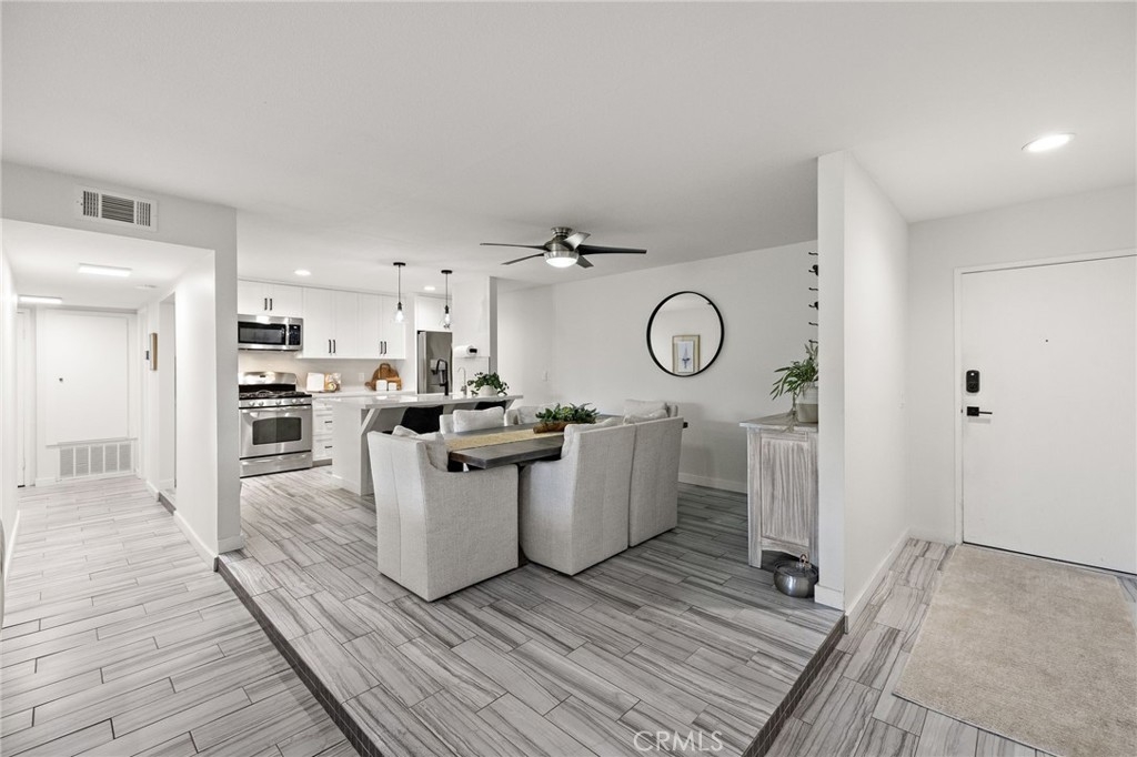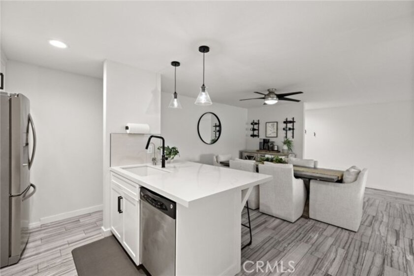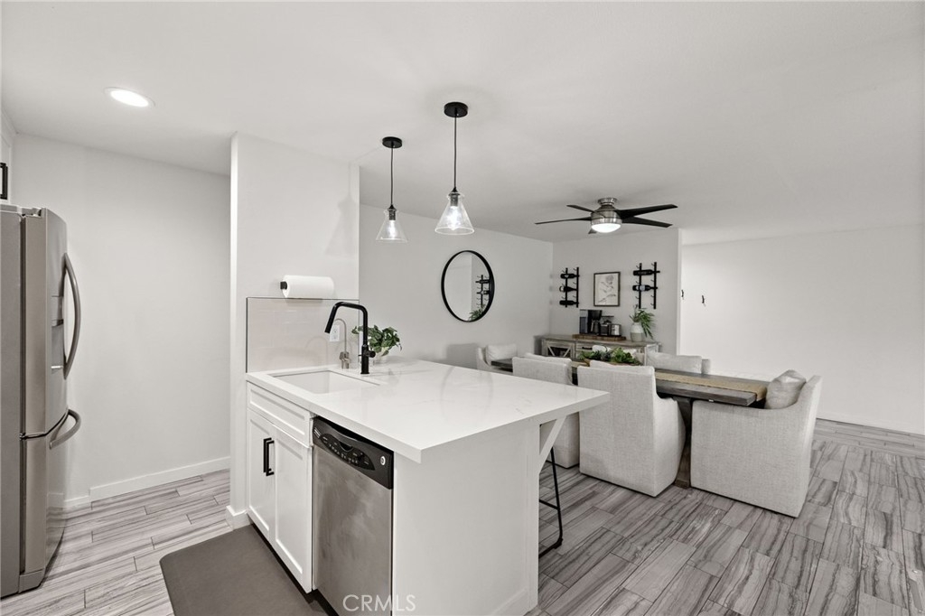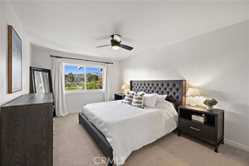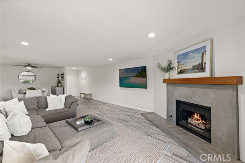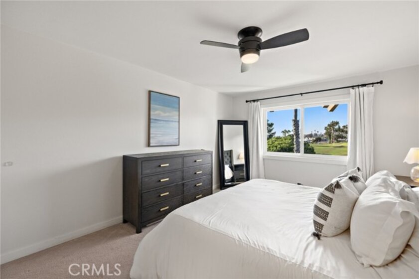 Perched on the top level of the Ocean Fairways community, this upgraded two-bedroom, two-bath home offers 1,326 square feet of single-level living and a rare vantage point over the lush fairways of the San Clemente Municipal Golf Course, with glimpses of the ocean beyond. Large windows and a spacious covered balcony draw in light and capture the home's tranquil setting. Inside, a modern concrete fireplace with custom mantel anchors the open living area. The kitchen combines quartz countertops, subway tile accents, ample cabinetry, and breakfast-bar seating for effortless everyday use. The primary suite enjoys wide golf course views, a generous closet, and an updated bathroom with double vanity and walk-in shower. A secondary bedroom and full bathroom complete the layout, while a dedicated laundry closet adds everyday convenience. Residents enjoy a private, gated community with countless amenities — pool, spa, tennis courts, recreation lounge with kitchen and fireplace, fitness rooms with saunas, and secure building access. HOA dues include water, cable TV, sewer, trash, insurance, and exterior maintenance — offering exceptional value and low-maintenance living. The location is a standout. Set directly across from the San Clemente Municipal Golf Course, the home also offers easy access to Vista Bahia Park and San Luis Rey Park for outdoor recreation. Plus, it’s only .9 miles to Calafia Beach, 1.6 miles to downtown San Clemente, and a short ride to Trestles, one of Southern California’s most coveted surf breaks. Golf cart and e-bike accessibility make it simple to reach beaches, parks, shops, and dining, while the community’s price point offers a more attainable way to enjoy the coveted coastal lifestyle San Clemente has to offer.