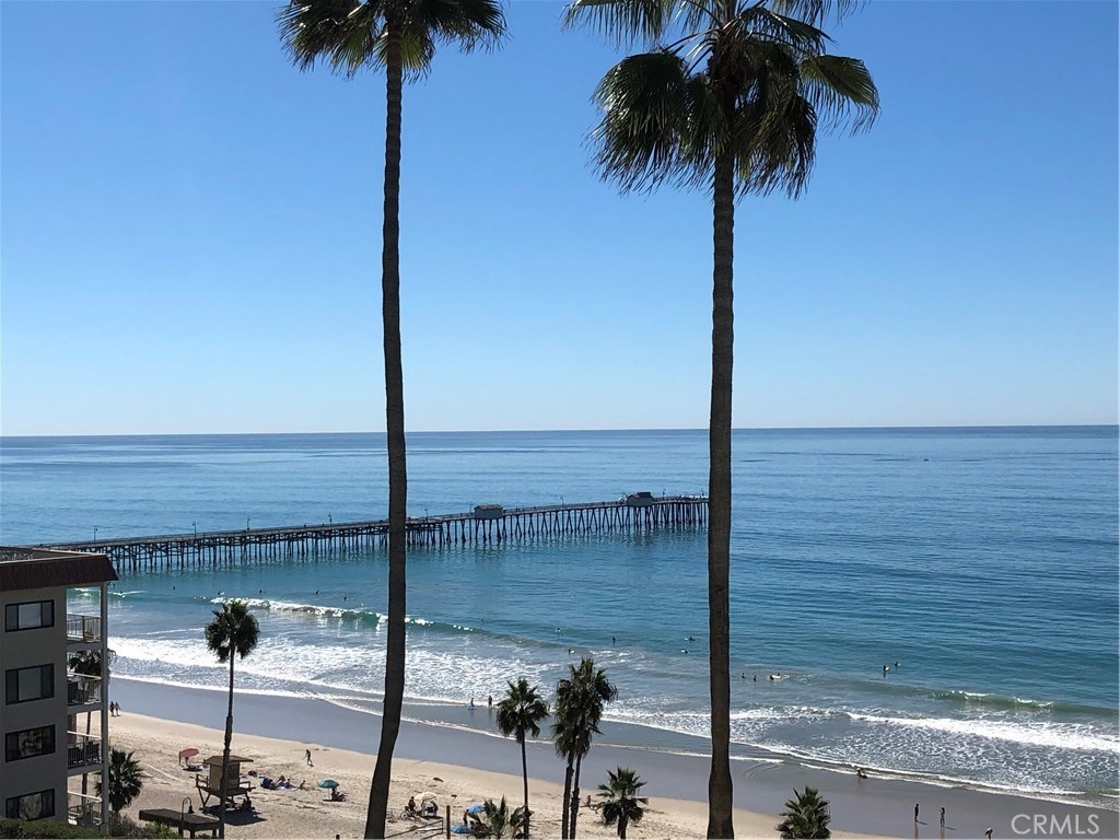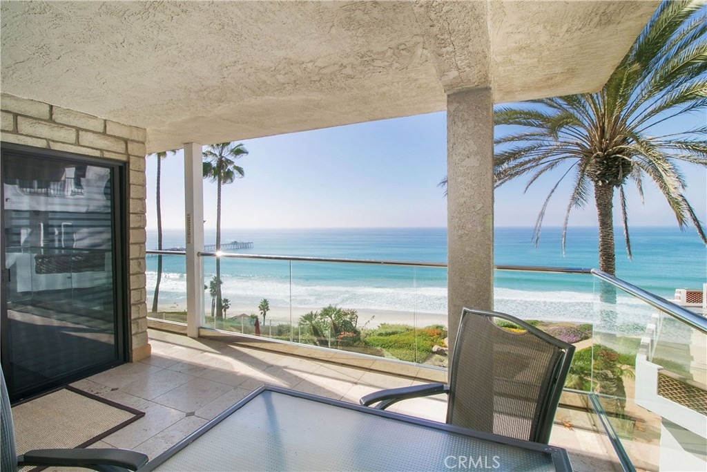 Spectacular ocean & pier view! View 4th of July fireworks from the confort of your extra large deck or living area. Very open concept floor plan. This is an end unit so is larger than most, 3 extra feet of width for entire length of building. Also, the end units have many other outstanding features such as all the extra windows that add light to the bedrooms and living areas. 3rd Bedroom does not have a closet, could also be office or game room. Massive living area with fireplace, crown molding, plantation shutters & travertine. Wet bar. Kitchen has tons of storage all custom cabinetry. Coffered recessed lighting, stone counters and backsplash, pull out drawers for pots and pans, stainless steel appliances. Washer,dryer & refrigerator included. Master bedroom has huge walk in closet, both bathrooms have gigantic tub/shower areas. Custom stonework in both bathrooms. Double sink vanity in master bedroom with granite counters. End units rarely come on the market and are very private. This unit is on same floor as gate entry and rose garden but there is an elevator for parking & clubhouse/pool facilities. Private access to beach. The clubhouse has a full kitchen & bath. Outdoor showers by newly renovated pool. Located just steps to famous Casa Romantica Cultural Center & nearby restaurants. Beach trail to pier or north to train station and south to infamous Trestle's surf beach. There is a closed circuit TV for monitoring most all areas of building, Phone allows call & entry.