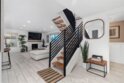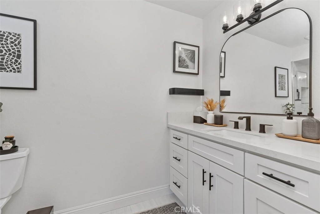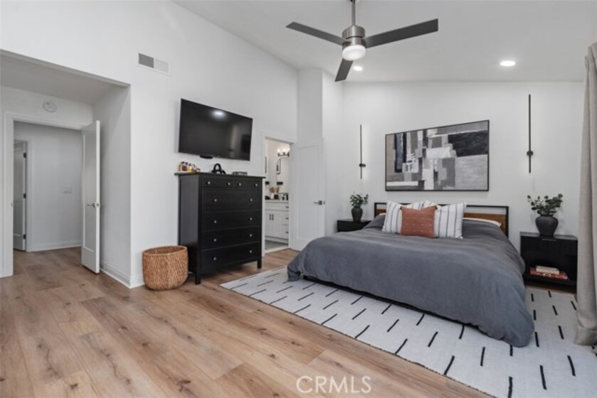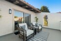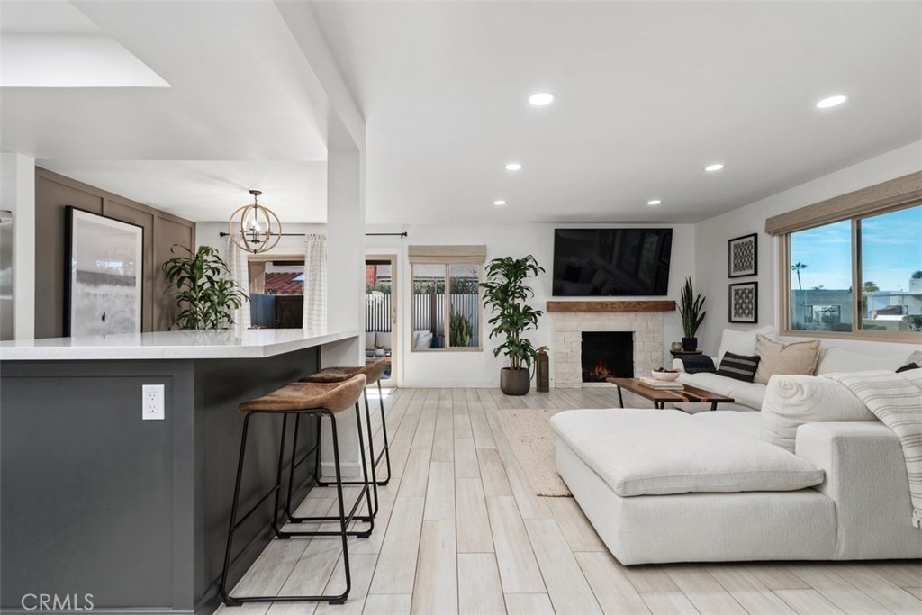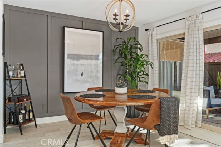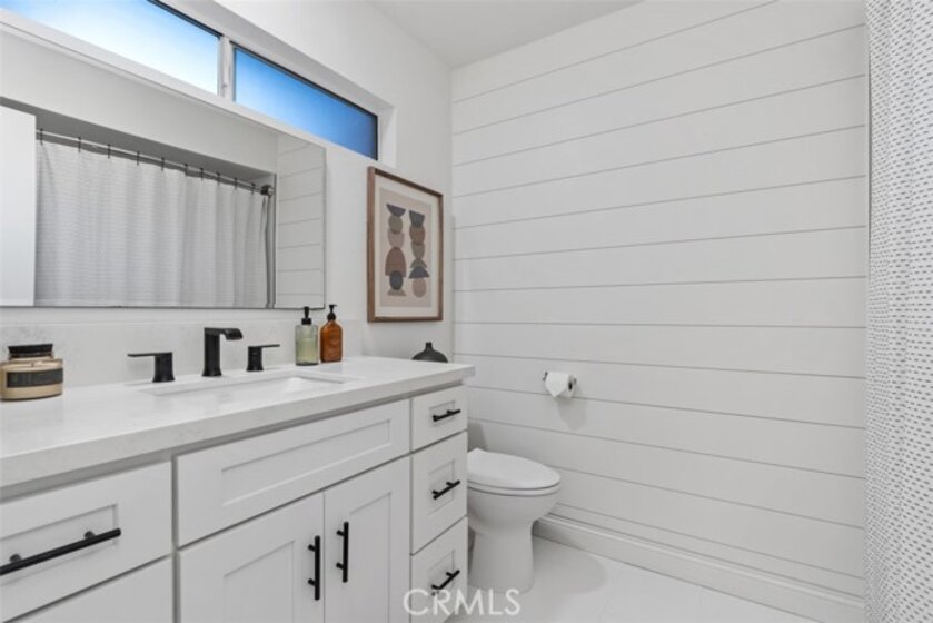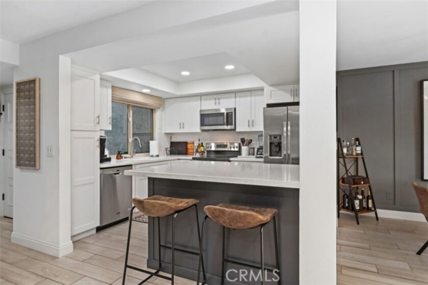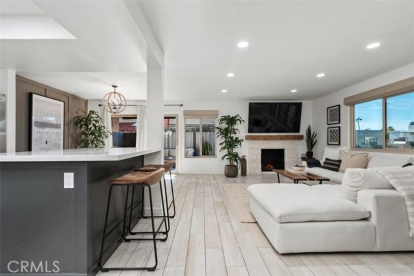 Stunning, extensively upgraded end-unit residence in a private, gated, beach-close community just minutes from the sand. The thoughtfully redesigned main level features porcelain tile floors throughout, creating a bright and cohesive living space anchored by an inviting fireplace and greenbelt outlook. The kitchen is both stylish and functional with white cabinetry, quartz countertops, stainless steel appliances, and a custom island with beverage fridge, organized storage, and trash/recycling pull-outs. Architectural details such as shiplap accents, wainscoting, accent wall trim, and Roman shades add warmth and character throughout the home. Upstairs, new luxury vinyl flooring flows through all bedrooms, complemented by a refinished natural-wood staircase and added recessed lighting. The primary suite offers vaulted ceilings, custom closets, a newly resurfaced private deck, and a beautifully updated en-suite bath with refined lighting, mirrors, and hardware. Two additional bedrooms are generously sized and include ceiling fans and great natural light. Recent enhancements also include a brand-new garage door, added garage cabinetry and storage racks, upgraded lighting throughout, a custom patio cover, paver perimeter, corrugated steel patio accents, and thoughtful landscaping. Residents enjoy resort-style amenities including pool, spa, and tennis courts, along with a peaceful greenbelt setting and close proximity to parks, shopping, dining, and world-class Southern California beaches.