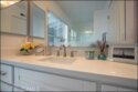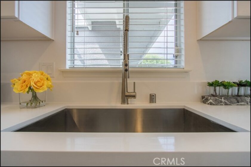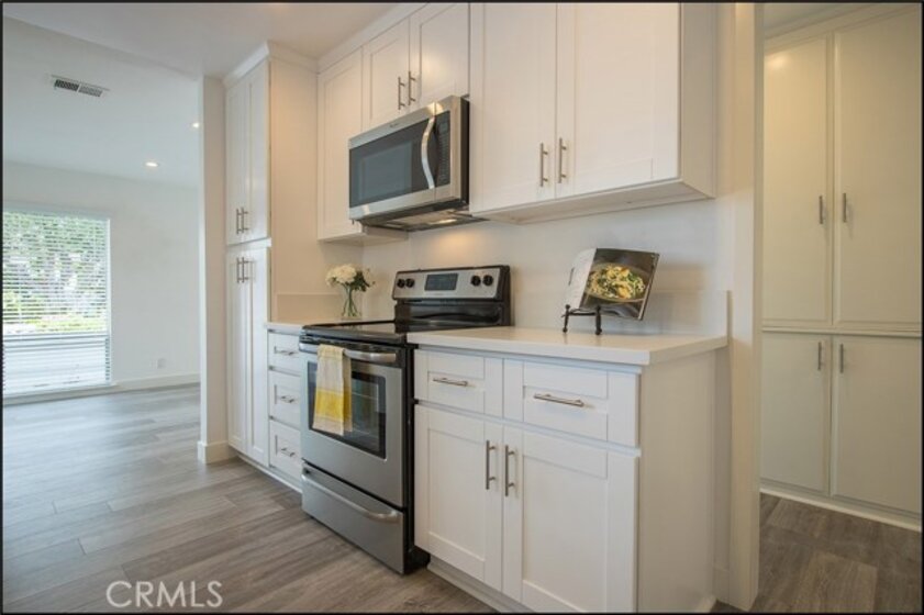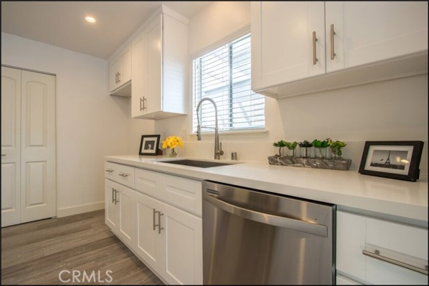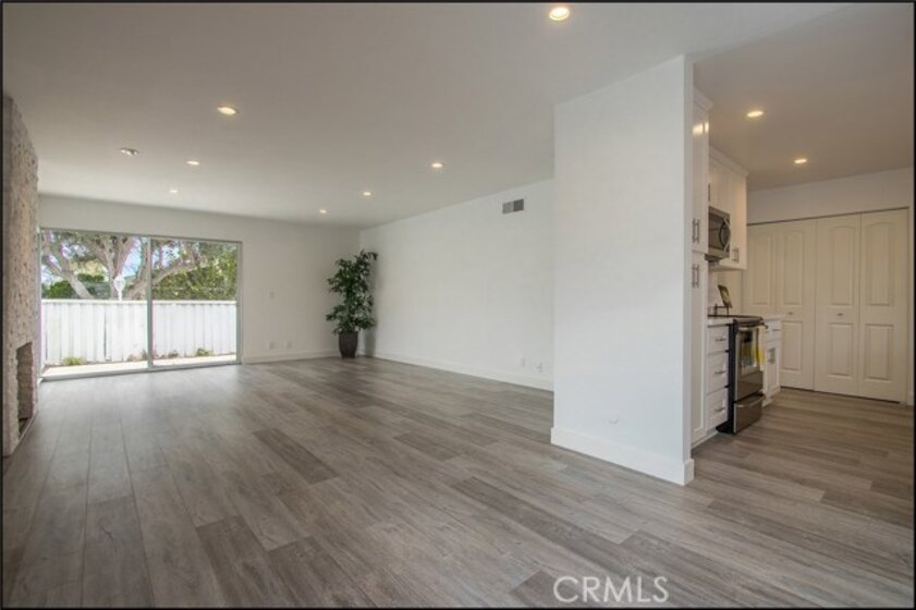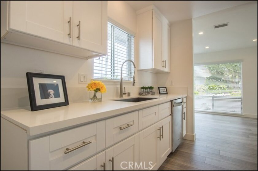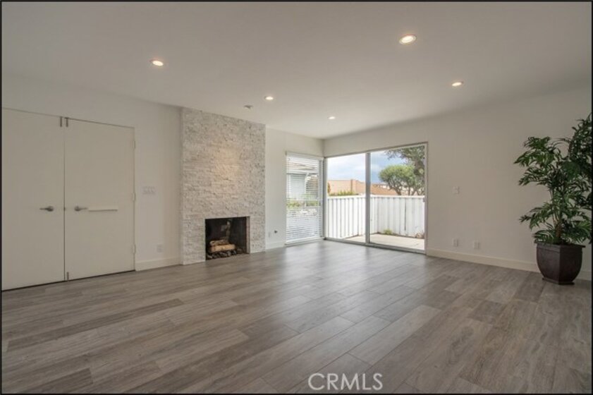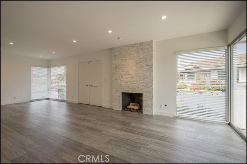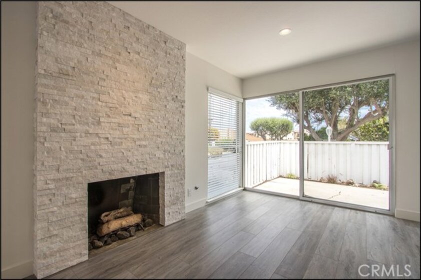 NOT 55 AND OLDER RESTRICTED! AWESOME SINGLE STORY, WALK TO THE BEACH, OPEN AND AIRY FLOOR PLAN WITH BRAND NEW DESIGNER UPGRADES THROUGHOUT, PEEK OCEAN VIEW, LARGE PATIO AND GARAGE! Highly sought after single level home with no one above or below, nice yard and stunning upgrades! large living and dining room with dramatic floor to ceiling newly installed ledger stone fireplace, spectacular kitchen with all new kitchen cabinets, contemporary Quartz counter tops, single tub rectangular stainless steel sink, designer faucet and brand new stainless steel appliances. Convenient full size inside laundry with washer and dryer included. Spacious master bedroom with large walk-in closet. Large bathroom with new cabinets, Quartz counter top, sink, faucet, toilet, fixtures and large shower/tub with designer frameless glass enclosure and high end chrome hardware. All new designer laminate wood floors and contemporary baseboards, upgraded recessed lighting, outlets and switches and raised panel interior doors with upgraded hardware. Sliding door access from living areas to large patio with large planters and enclosed garage. Highly sought after beach close community, not age restricted and spectacular upgrades throughout!